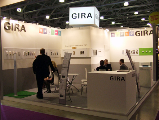 На стенде Gira (№ Н 625), расположенном 8-м зале павильона № 2 ВК «Крокус Экспо», была представлена целая группа изделий Gira: Gira Pro-face, Gira HomeServer 3, компоненты системы Instabus KNX/EIB и домофонной системы, в том числе и действующие квартирные станции. Также были продемонстрированы энергетическая стойка Gira, дизайн-серии розеток и выключателей – Gira Esprit, Gira F100, Gira Event Clear, Е2.