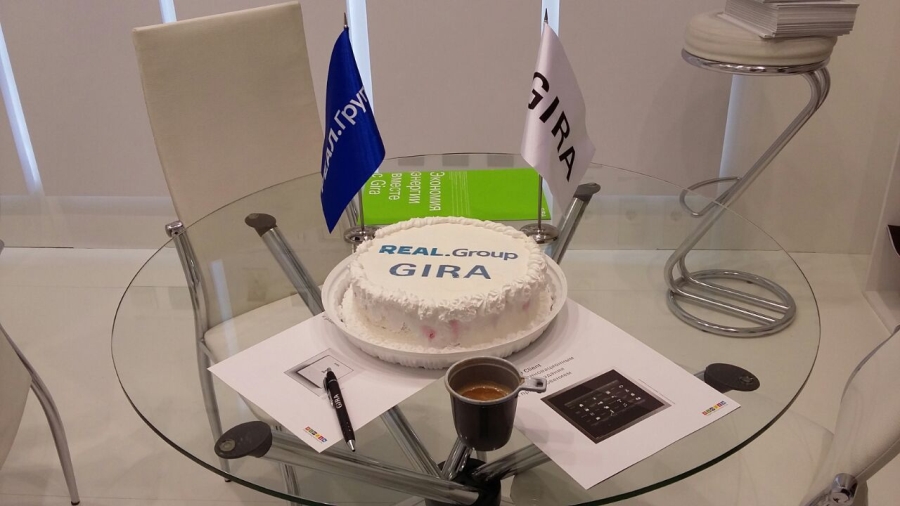 Выставка «АрхМосква» открылась! К началу работы экспозиции Gira наши коллеги из «Реал Групп», работающие на стенде, «испекли каравай»: ими специально ко дню открытия экспозиции был заказан торт с изображением двух логотипов — GIRA и Real Group. Жаль, что не всем достанется по кусочку этой замечательной dolce vita, но сам факт очень красноречив. Спасибо нашим дилерам из «Реал Групп» за их внимание к бренду Gira и фантазию!