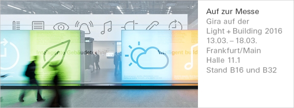 Представители компании Gira с нетерпением и волнением ждут гостей на своих стендах В16 и В32, расположенных в Павильоне 11.1. Все, кто побывает на экспозиции Gira, запомнят ее как одно из ярчайших впечатлений года! Gira представит во Франкфурте 10 основных групп выпускаемых продуктов: это и решения для автоматизации оборудования зданий, и домофония, и системы управления светом, и сетевые инсталляционные системы, и дизайн-серии выключателей, и разнообразные датчики. Всё для разумного комфорта, для человека и его дома! Конечно, пока сохраняется интрига — что именно покажет Gira, станет известно лишь 13 марта, в день открытия Light + Building 2016. Несомненно, новинки компании удивят профессионалов, ведь новейшие предложения Gira всегда вызывают их огромный и обоснованный интерес.