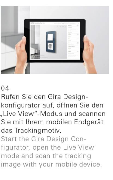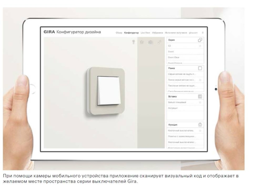 Конфигуратор дизайна Gira быстро и просто дает подлинную картину того, как серия выключателей Gira E3 выглядит в реальном окружении и насколько она подходит к индивидуальному стилю жилья. Для этого уникальный режим «Live View» конфигуратора дизайна использует камеру смартфона или планшета.