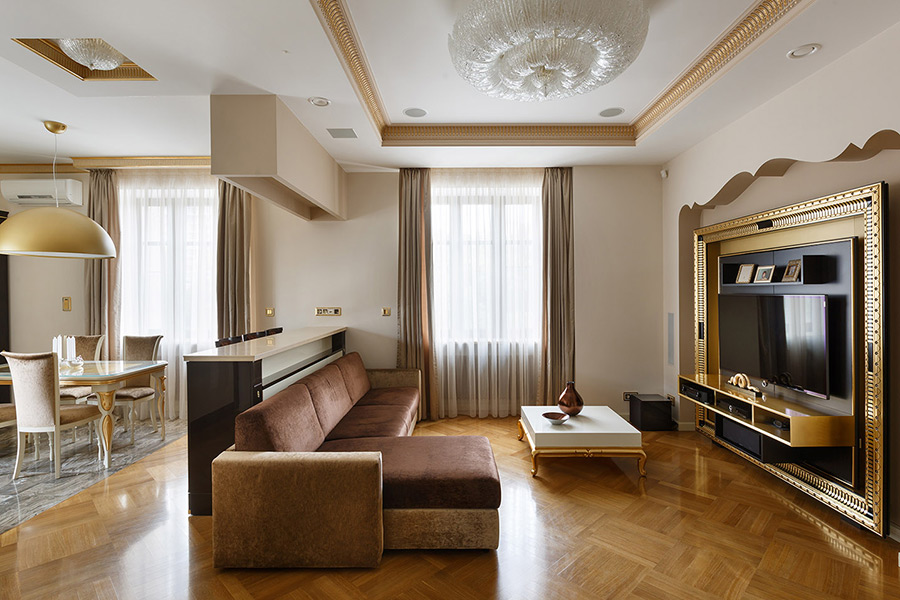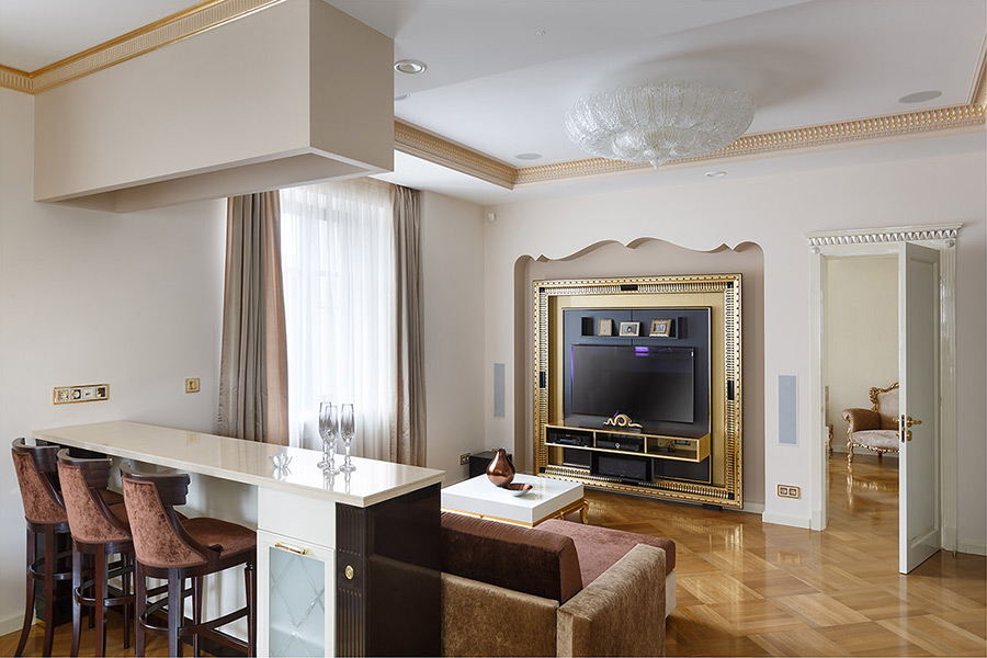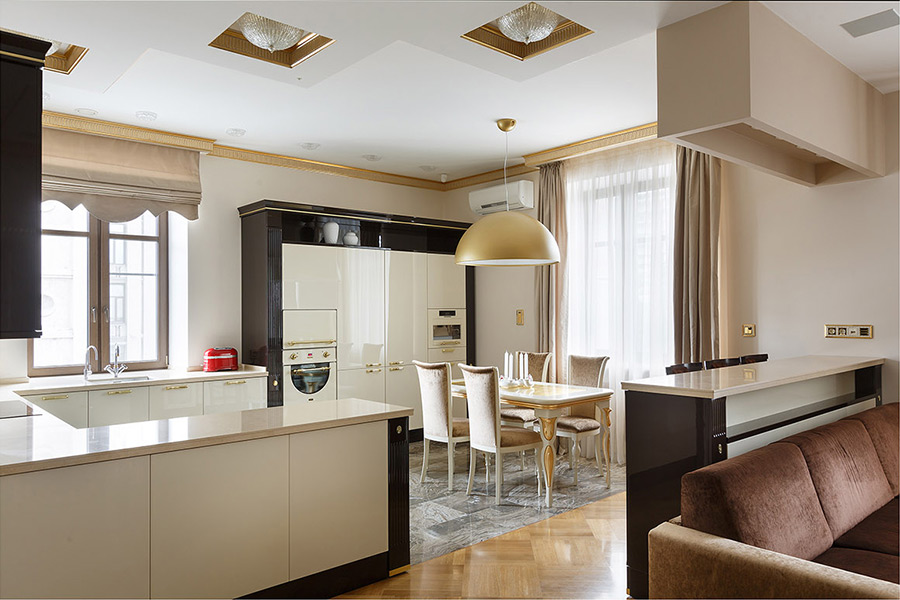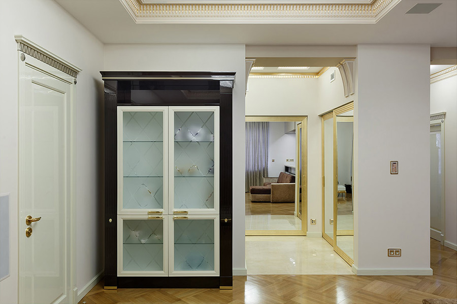 Подводя итоги уходящего года, мы вспоминаем различные яркие моменты и приятные события. Выход в свет новых серий Gira, интересные мероприятия и, конечно, яркие проекты. Сегодня хотелось бы рассказать Вам об очень интересном проекте, который был реализован нашим дилером Реал Электро и архитектором Валерием Крауклитом. Обычная квартира в «сталинке» обрела новый облик, величественный и помпезный, но нисколько не напыщенный. Золотой, кремовый, слоновая кость — это основные цвета, в которых выполнены все элементы интерьера, но благодаря усилиям дизайнера, квартира выглядит утонченной, легкой и светлой.