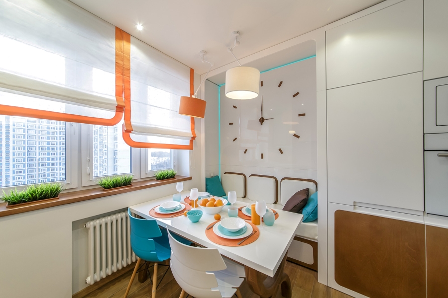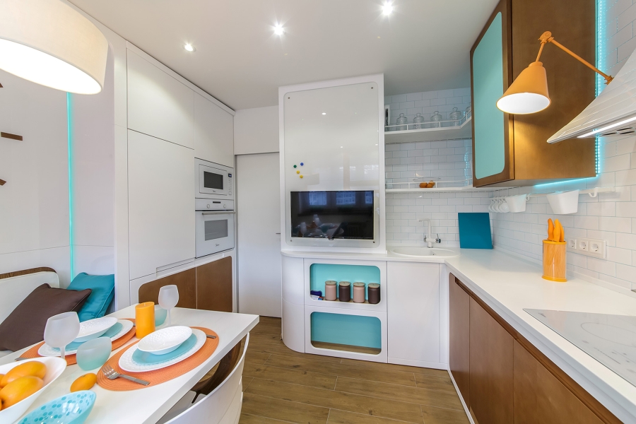 Мы не знаем, так ли это у Анастасии и Сергея Бородиных, но в рамках программы «Переделка» дизайнер Виктория Павленко помогла сделать кухню насколько удобной и красивой, что туда хочется возвращаться снова и снова. В готовке хозяевам теперь помогает современная техника. Теплые оттенки натурального дерева, а так же яркие оранжевые и бирюзовые аксессуары придают кухне стильный и современный внешний вид. Уютный диванчик, расположенный в нише, и многоцветная светодиодная лента позволяют настроить освещение под любое настроение. А розетки и выключатели Gira Esprit прекрасно завершили образ, делая минималистичную кухню более изящной.