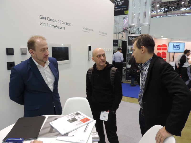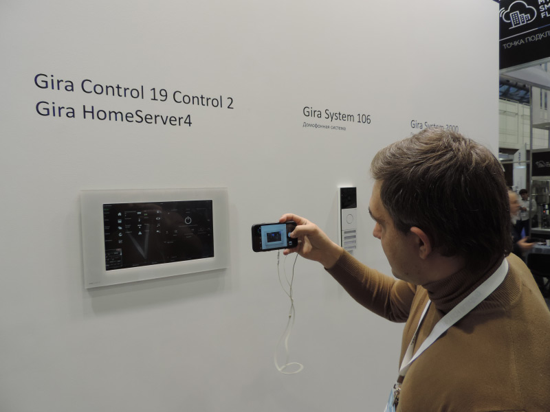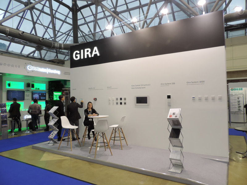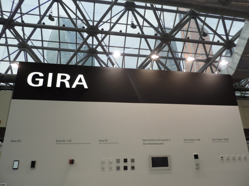 На выставке были представлены панели управления домофоном и умным домом Gira G1 в белом и черном цветах, комбинация модулей удаленного доступа Gira X1 + S1 для управления интеллектуальным зданием, ПК с сенсорным экраном Gira Control 19 Control 2, сервер Gira HomeServer 4, домофонная система Gira System 106, система управления светом и жалюзи Gira System 3000 и новая серия выключателей System 55 Gira E2. Все продукты Gira демонстрируют не только прекрасное немецкое качество, но и великолепный современный дизайн.
