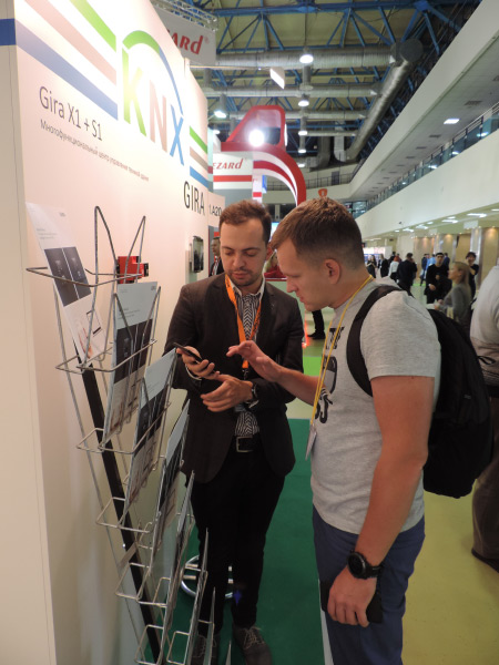 Алексей Королевич, руководитель Отдела технической поддержки компании «ГИЛЭНД», провел подробную презентацию о новинках Gira для организаторов выставки. А технический специалист, Кирилл Коростелев, постоянно консультировал посетителей выставки.