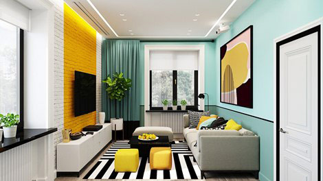 Гостиная будет дерзко яркой и по-летнему тёплой. Преобладающими оттенками будут белый, мятный, манговый с темными цветовыми вставками. Такое необычное сочетание цветов напоминает бабочку монарх, порхающую среди летней цветущей зелени. А выключатели Gira ненавязчиво подчеркнут эту летнюю легкость, яркость и воздушность.