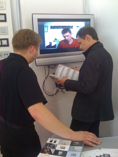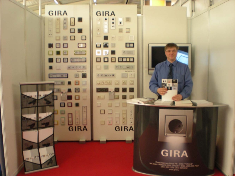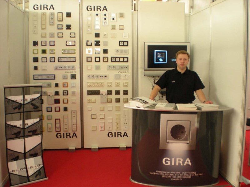Традиционно на стенде Представительства работали специалисты компании «Аура Сити НН» - официального дилера «Гилэнда». На стенде была представлена полная линейка дизайнерских серий рамок. Благодаря просмотру видеороликов, постоянно прокручиваемых на экране установленной телевизионной панели, посетители стенда имели возможность более детально ознакомиться с продукцией Gira. Здесь же, в режиме on-line, проходили видеоконсультации, которые для пришедших на стенд посетителей провели технические эксперты ООО «Гилэнд». Такой вид общения смело можно назвать инновационным шагом в сфере профессионального электротехнического сервиса.