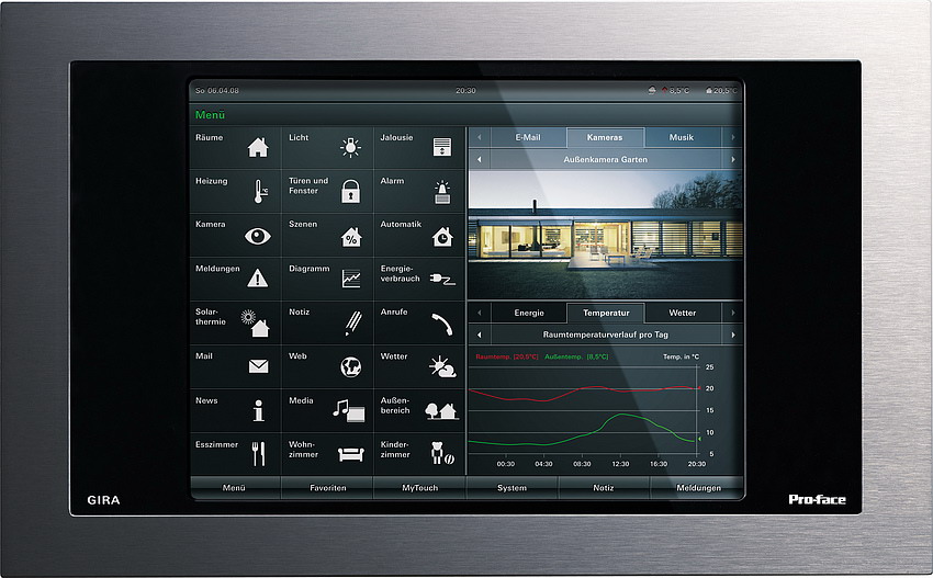На престижной международной выставке Light&Building 2008 в числе своих новых разработок немецкая электротехническая компания Gira экспонировала новый интерфейс Gira для Gira HomeServer или Gira FacilityServer. Новый интерфейс Gira теперь возможно отобразить на Pro-Face ServerClient 15 и других средствах хранения и передачи информации таких, например, Smartphones или устройствах Apple ipod/iphone. Понятное и структурированное меню предоставляет доступ ко всем функциям. Теперь Вы можете создать индивидуальную заставку, установить собственный пункт меню «Фавориты», управлять аудиоаппаратурой, получать видеоизображение с камер и смотреть диаграммы, например, график потребления энергии. Кроме этого доступны такие Internet-функции, как новостные службы в формате RSS, E-Mail и сводки погоды. Имеется возможность установки дополнительного программного обеспечения: например, специальной программы фирмы REVOX для операционной системы Windows при помощи которых можно управлять системой Revox multiroom.